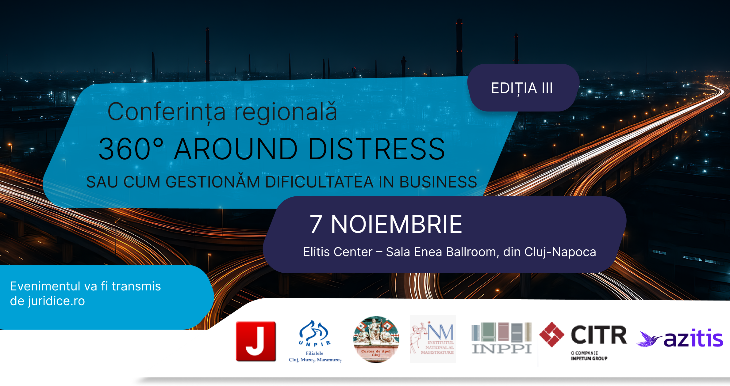 Conferința regională „360° Around Distress – Cum gestionăm dificultatea în business”, ediția a III-a, va avea loc în data de 7 noiembrie 2025, organizată de UNPIR Filialele Cluj, Mureș și Maramureș, în parteneriat cu Curtea de Apel Cluj, Institutul Național al Magistraturii (INM) și Institutul Național pentru Pregătirea Practicienilor în Insolvență (INPPI).